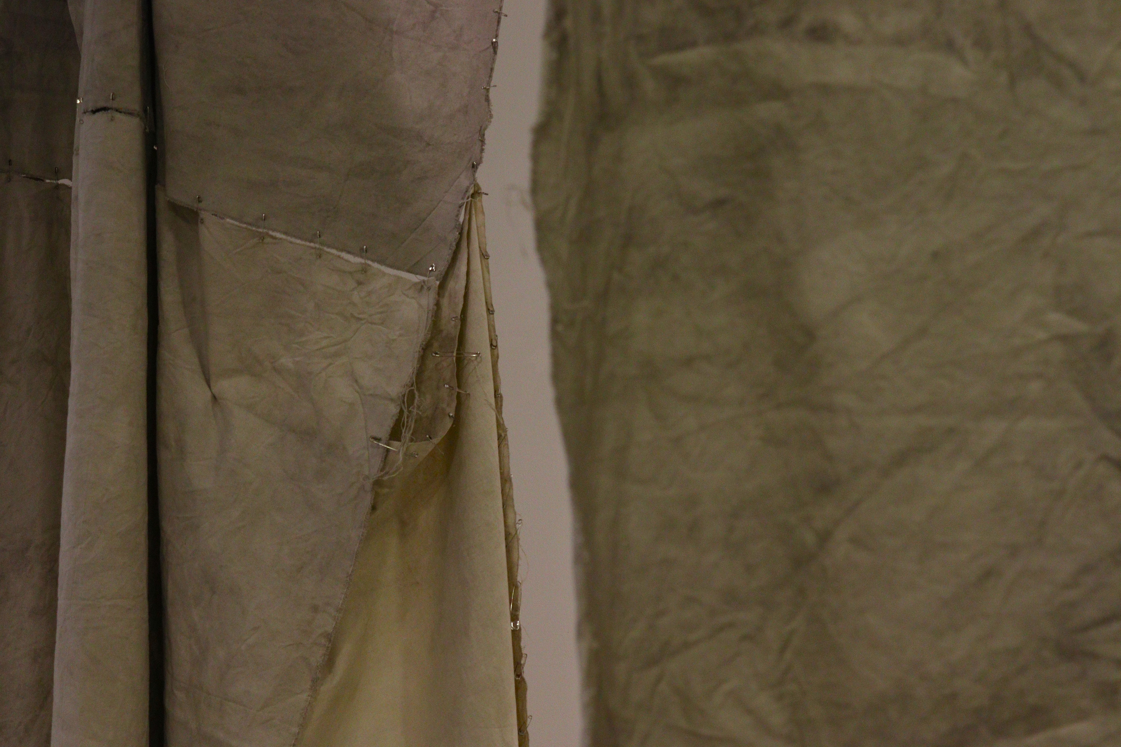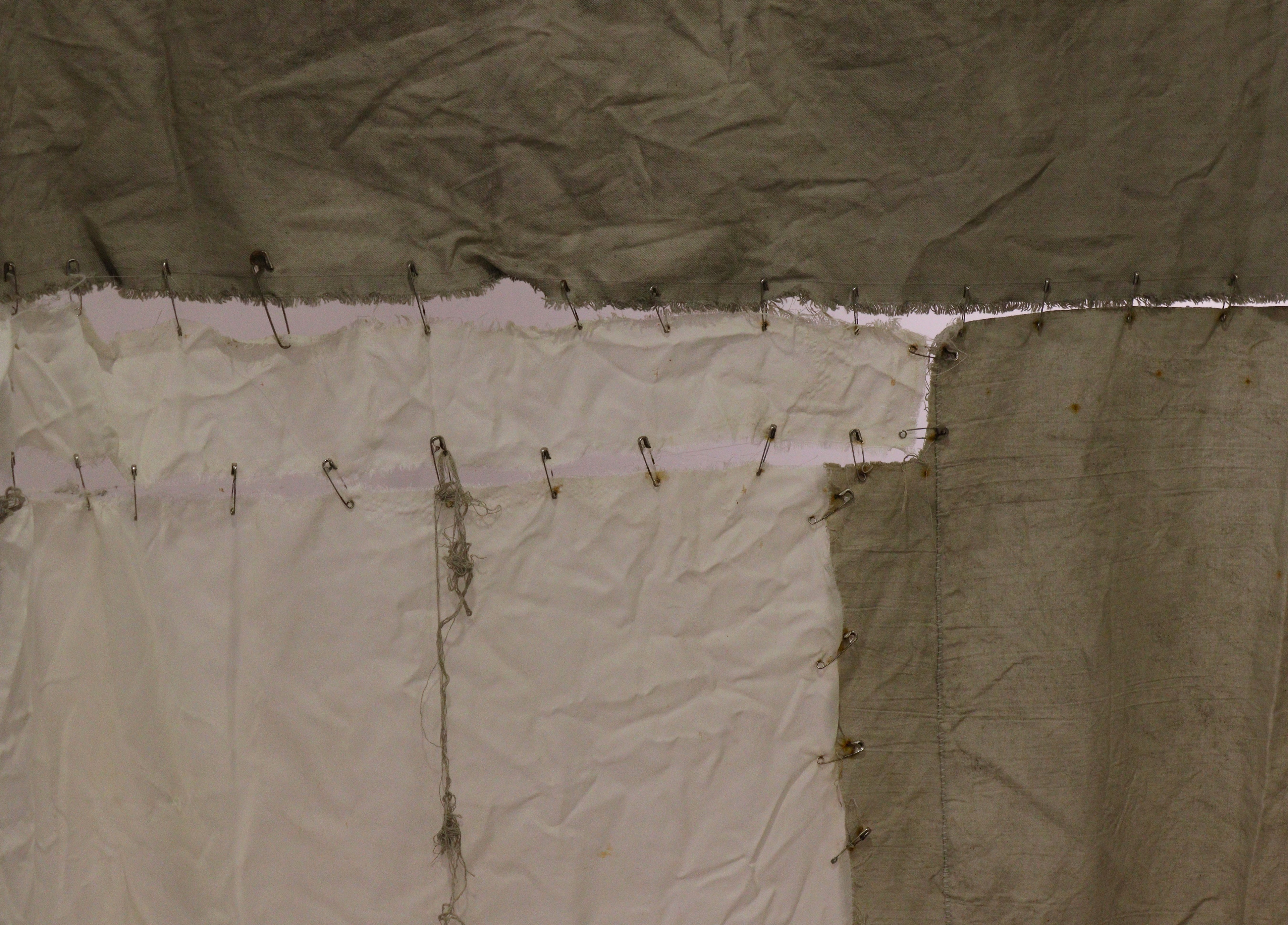 A site-specific mixed media installation including fabric, safety pins, and an A1 framed digital photograph with text.